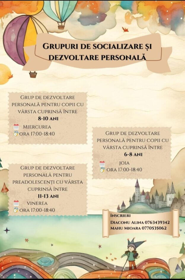 🎯 Exerciții de dezvoltare personală specifice fiecărei categorii de vârstăȘedințele se vor desfășura săptămânal, de la ora 17 sau 18, cu durata de 100 minute, într-un grup format din maxim 7 copii, costul fiind de 150 lei
